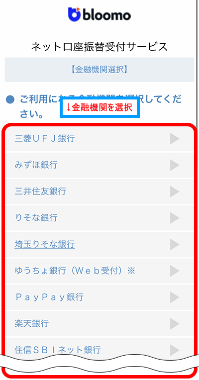 引き落とし口座に設定したい金融機関を選択してください。選択した金融機関のページに移動するので、案内にしたがって登録を進めましょう。